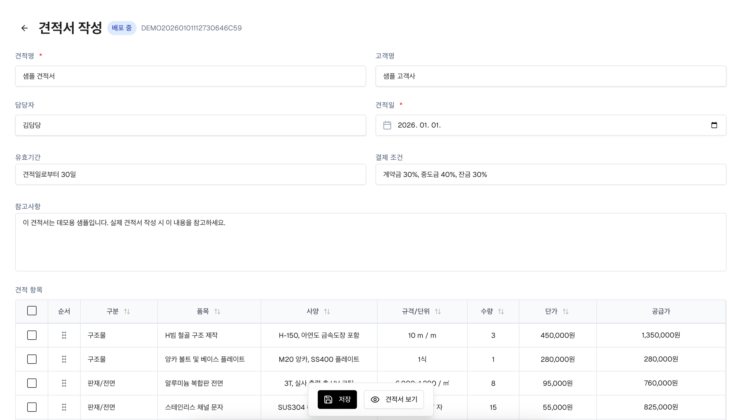 품목·옵션·단가를 한 번 등록하면, 다음부터는 클릭만으로 견적 생성. 반복 업무가 90% 줄어듭니다.
